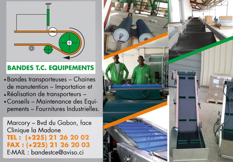 Vente de bandes transporteuses et de chaines de manutention – Importation et Réalisation de Transporteurs. Maintenance des équipements – Fournitures Industrielles – Conseils. L’entreprise BANDES TC Equipements dispose d’un bureau d’études pour la conception et la réalisation de vos installations s’adaptant à tous types de terrain.